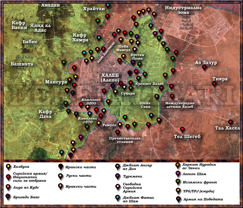 Разпределение на силите в Халаб (Алеппо) към 03-10-2016г. Основните сражения  се водят около Комплекс 1070 и квартала Бустан ал Паша