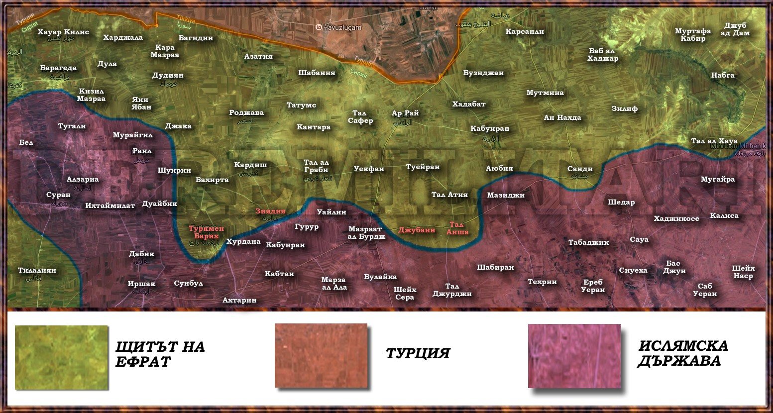 Фронтът около ар Рай. В червено са имената на селищата, завзети от Щитът на Ефрат за последните 72 часа