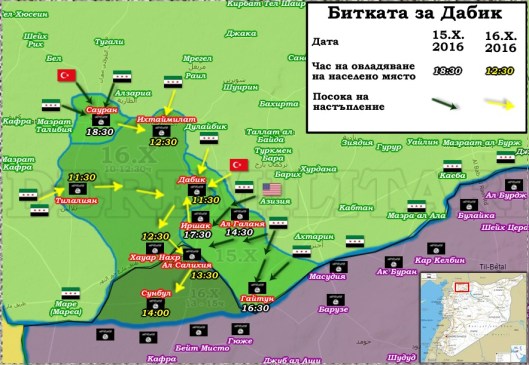 Атаката срещу Дабик започна в утрото на 16-ти октомври и след неколкочасови боеве, около 12:30 града беше завзет от силите на ЩЕ. Паралелно с тази атака, частите на ЩЕ атакуваха Тилалиян и Ихтаймилат, които паднаха около половин час след Дабик. След тези бързи успехи, силите на ЩЕ се насочиха на юг и превзеха Хоуар ал Нехр, Ас Салихия и Сунбул. Към момента, силите на ЩЕ се намират на север от Кафра и вероятно ще атакуват това селище до края на деня, възползвайки се от отстъплението на „Ислямска държава“, чийто бойци масово се изтеглят към Ал Баб.
