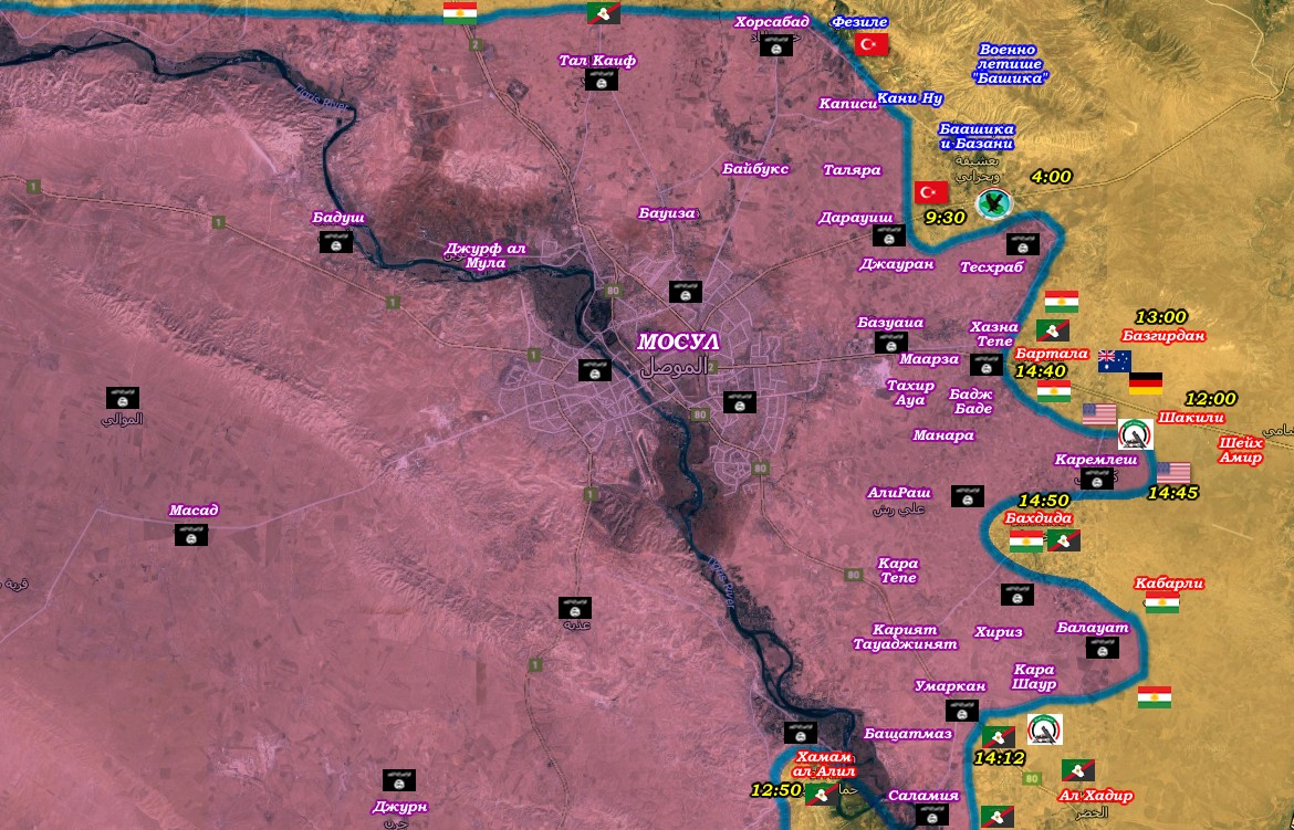 Започналата призори офанзива на широка коалиция от сили срещу владенията на Ислямска държава около Мосул, се разгръща с пълна сила, особено след поредица от пробиви във вражеските позиции, постигнати след 12:00 българско време.