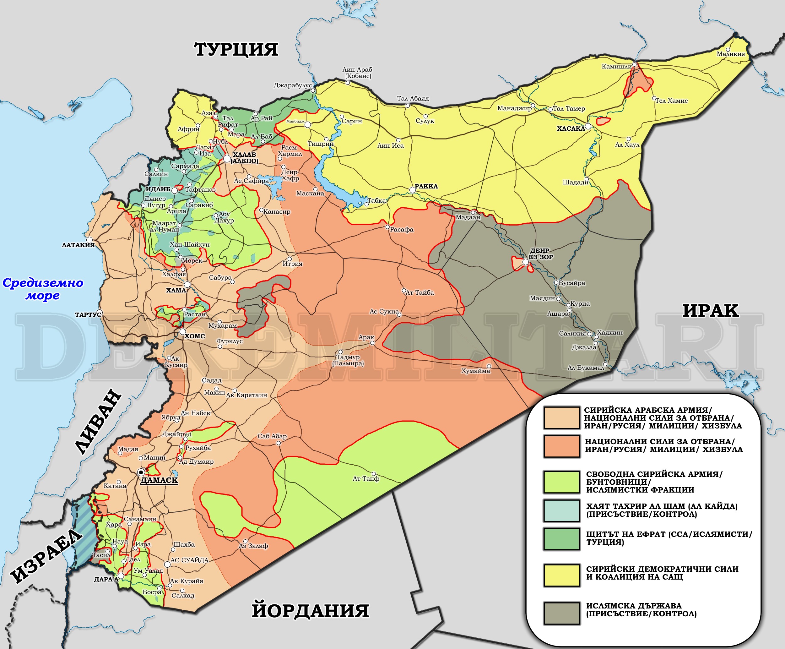 Ал Кайда, Деир ез Зор, Идлиб, Иран, НСО, Ракка, Русия, САА, САЩ, ССА, Свободна Сирийска армия, Сирийски Демократични Сили, Сирия, Хаят Тахрир ал Шам, Хизбула, кюрди, милиции, YPG