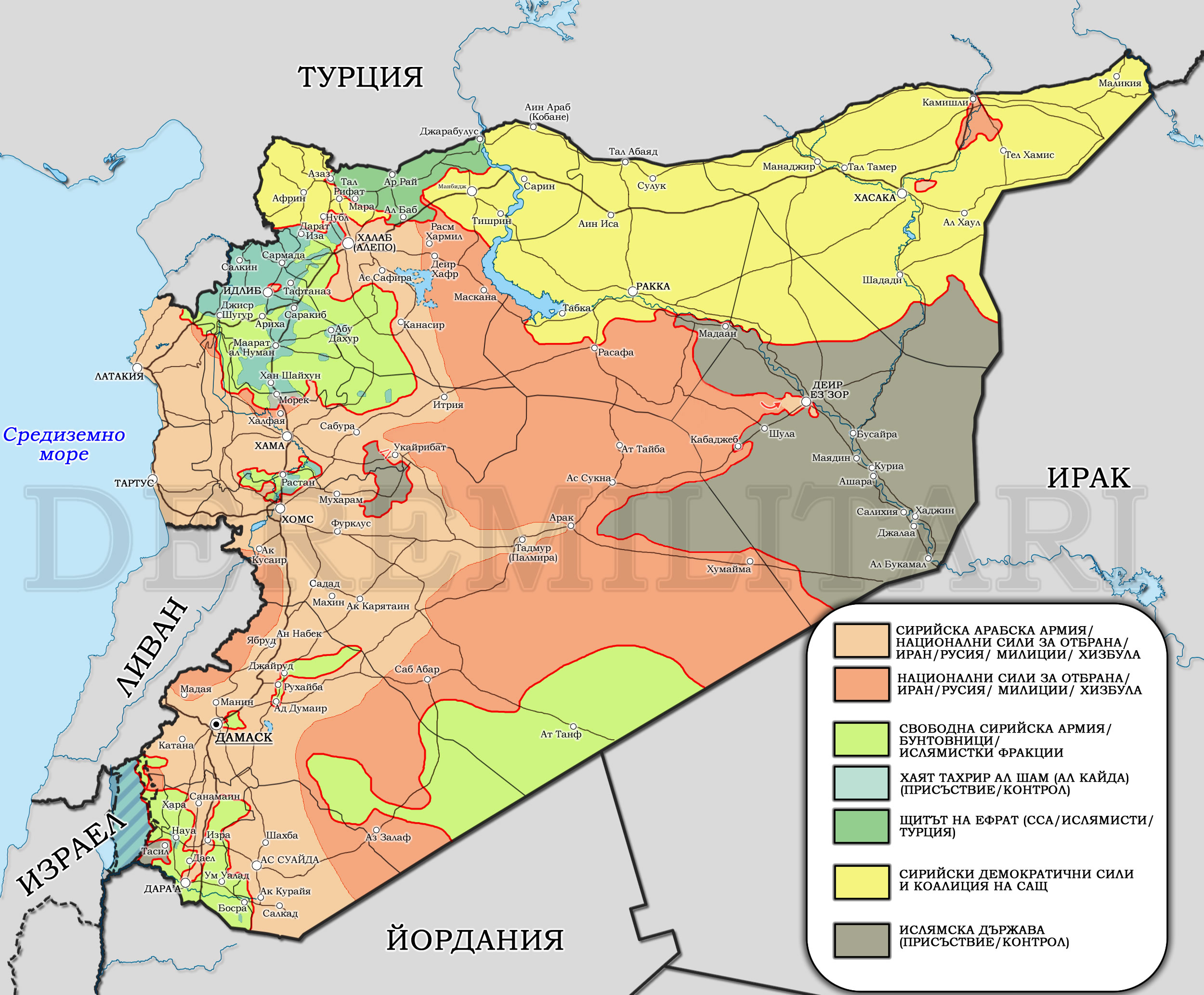 Фронтовете в Сирия към 22:00 ч. българско време на 5-ти септември. Картата коригира неточност от предишните дни, отнасяща се до градовете Шула и Кабаджеб, които все още са под контрола на ИД