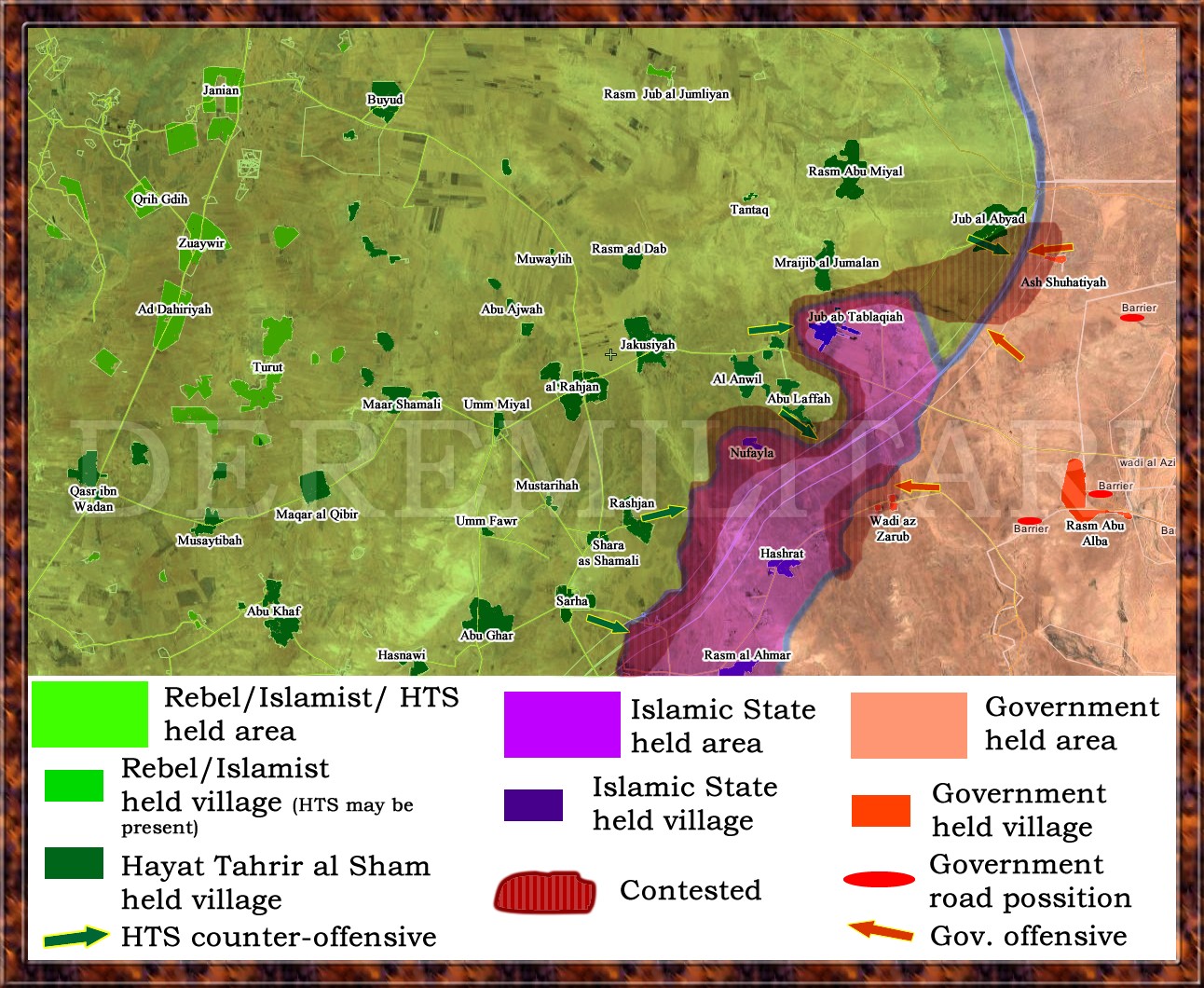 Отряд от около 150 бойци, заедно с двадесетина превозни средства – самоделни коли-бомби, танк, хъмвита и модифицирани пикапи атакуваха изненадващо предните позиции на джихадистите от ХТШ и постигнаха изключително бърз успех – близо 20 селища бяха завзети в рамките на по-малко от 20 часа. Подобна ситуация се разигра и в централна Сирия около Сухна и по на запад около Карятайн, където сходни по размер части на ИД удариха предните позиции на сирийските про-правителствени сили в рамките на офанзивата „Аднани“.