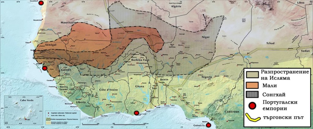 Европейската търговия с роби, стартирана от португалците и продължена от испанци, холандци, англичани и французи изиграва своята роля за радикализацията на местното население. По долината на р. Нигер, особено в долното течение, се появяват няколко робовладелски кралства, които постоянно атакуват населението на саваната в търсене на плячка, която да продадат на „белите“ търговци. Това води до постоянни конфликти и изостряне на напрежението в региона.
