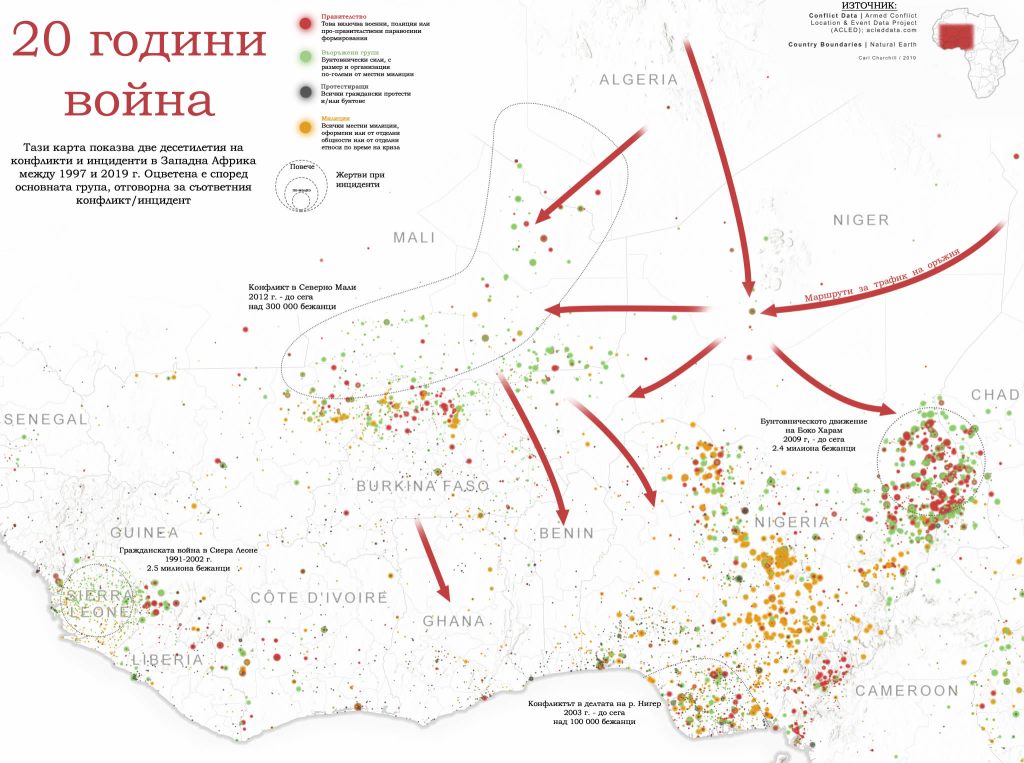 Карта, показваща две десетилетия на конфликти в Западна Африка. В различни цветове са групите отговорни за съответен конфликт.