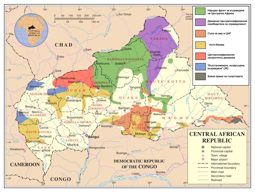 Обновена карта на Централноафриканската република и зоните на контрол. Трябва да се спомене, че има обвинения към бунтовническия алианс за получаване на подкрепа от страна на бившия президент Франсоа Бозизе и Франция. Правителствените сили са подкрепени от Русия чрез наемниците от „Вагнер“ и войски от Руанда. На територията на ЦАР действат и милиции, ползващи се с мълчаливата подкрепа на Судан и Чад.