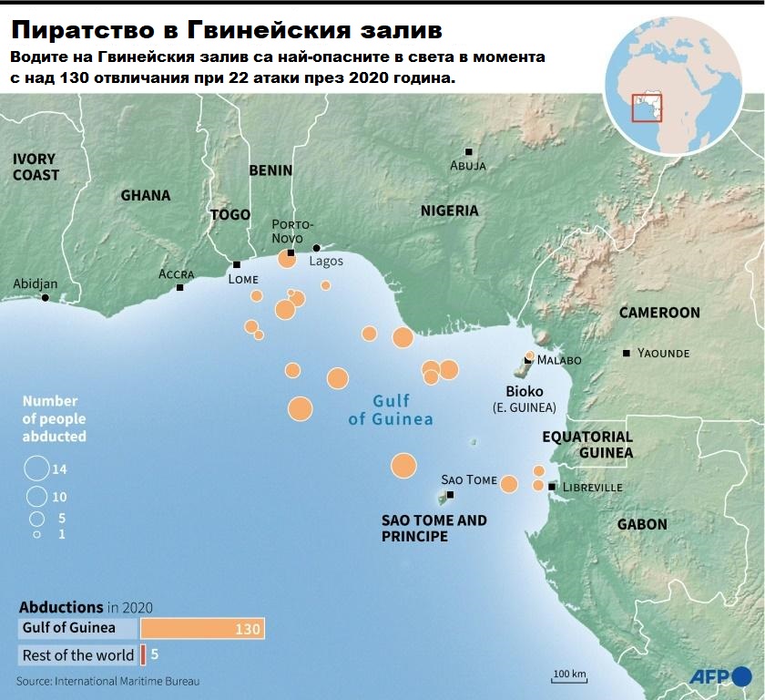 Нигерийските води са в центъра на Гвинейския залив, огромна площ на Атлантическия океан, простираща се от Сенегал до Ангола, която е източник на все по-голямо безпокойство за собствениците на кораби, операторите и техните екипажи. Миналата година отбеляза ръст в отвличанията на моряци в района, като именно тук се случват 95% от всички инциденти и нападения. Заложниците обикновено са скривани в южната част на Нигерия в делтата на Нигер – гъста мрежа от потоци и блата – докато се договори откуп. Методите на западноафриканските пирати могат да бъдат по-жестоки от тези край Африканския рог. Докато сомалийските пирати знаят, че ще загубят откупа, ако заложниците им бъдат наранени, пиратите на западното крайбрежие на Африка се интересуват главно от петрола или ценния товар на борда, и са по-малко загрижени за хората.